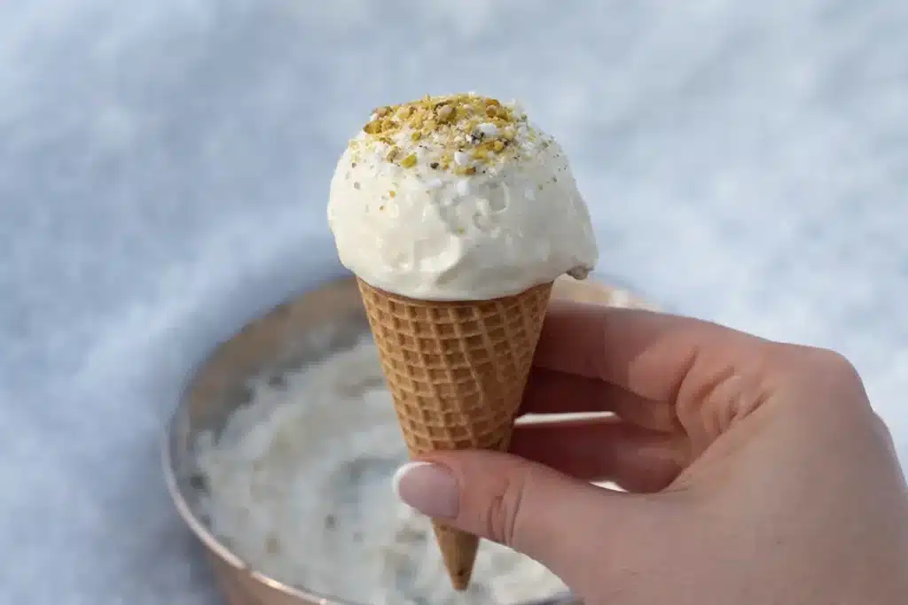 Hand holding viral snow ice cream in a waffle cone with nut topping, made using the salted snow bowl method.